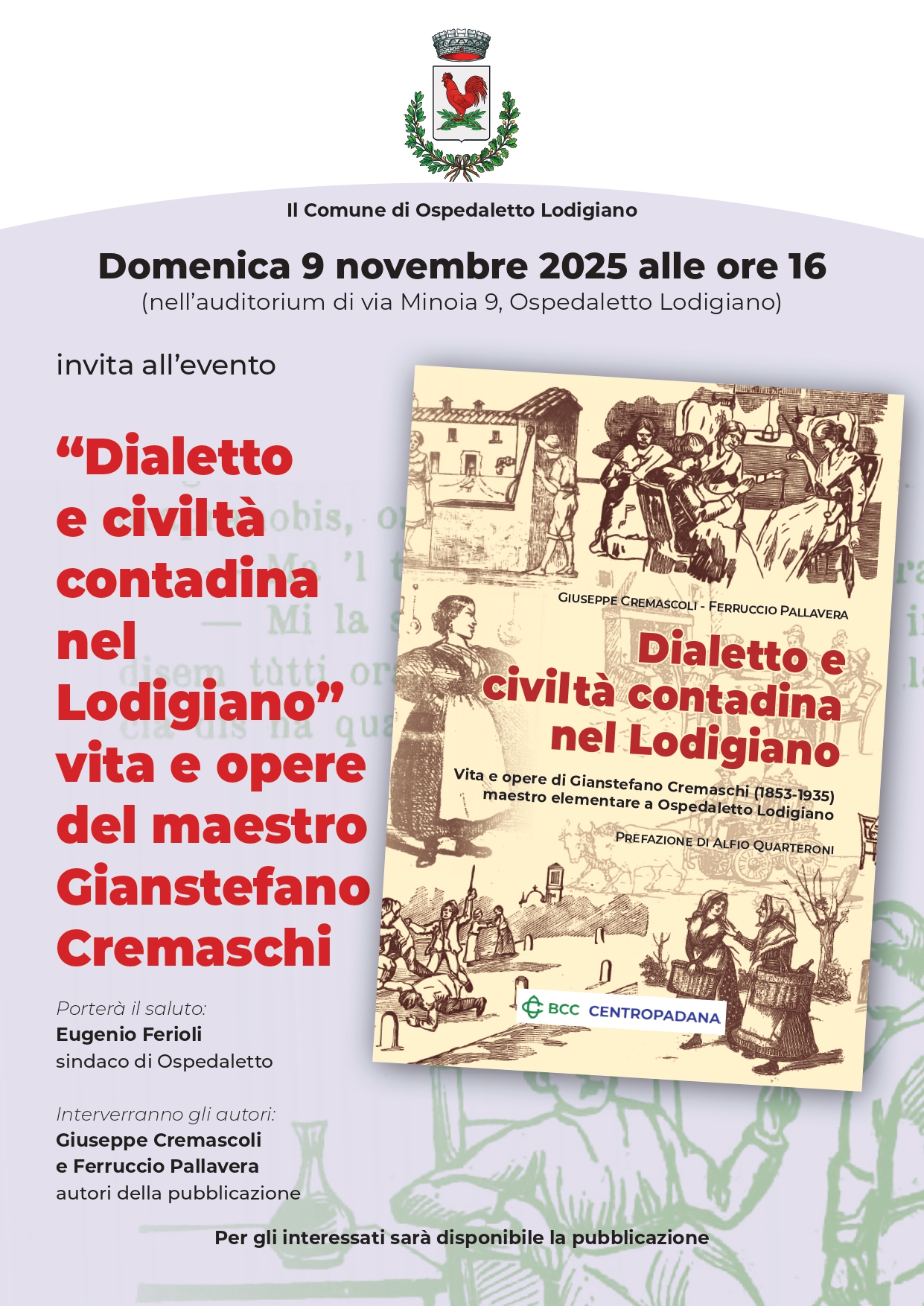 DOMENICA 9 NOVEMBRE, alle ore 16:00 presso l'Auditorium di via Minoia 9, sarà presentato il libro "Dialetto e civiltà contadina nel Lodigiano, vita e opere del maestro Gianstefano Cremaschi". Il maestro Gianstefano Cremaschi (1853-1935) fu per molti anni maestro elementare a Ospedaletto Lodigiano e scrisse quelle che ancora oggi sono tra le più belle opere dialettali lodigiane.