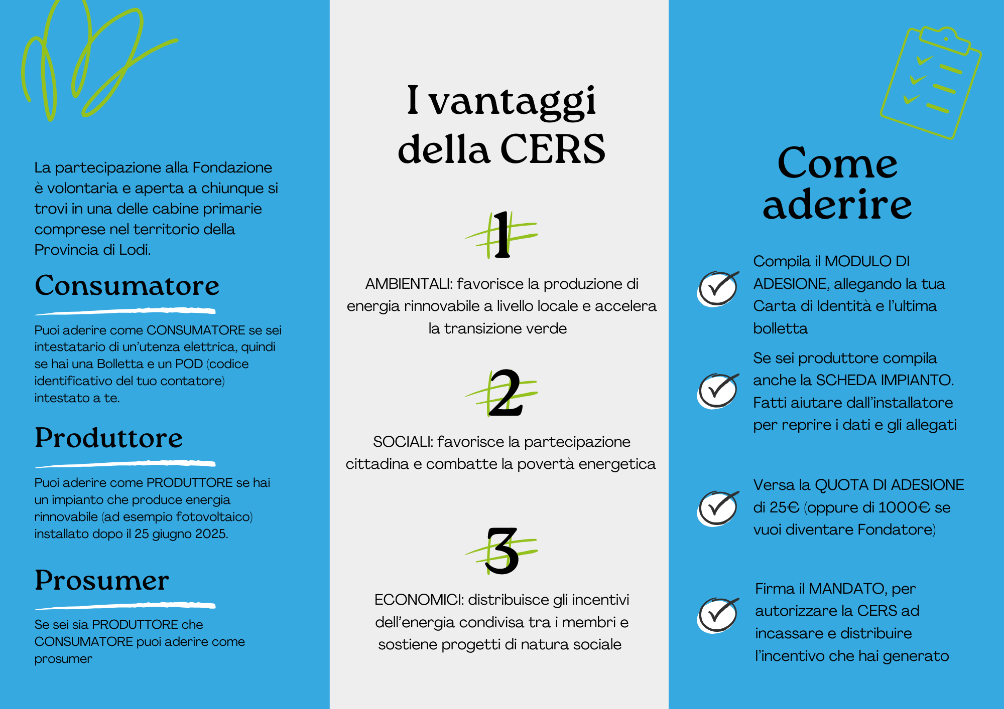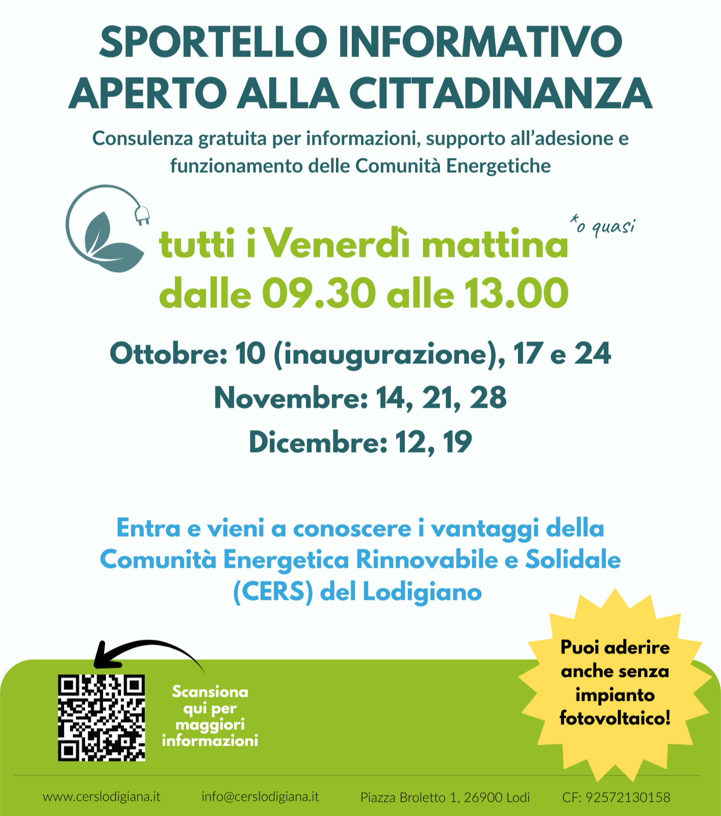 Negli allegati l'invito a partecipare alla cerimonia di inaugurazione e gli orari di apertura dello sportello nonché i vantaggi sia ambientali che sociali che economici dell'adesione alla CERS.